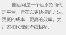 圈酒招商網(wǎng)是繼糖酒會(huì)之后的招商模式,為酒廠(chǎng)等生產(chǎn)經(jīng)銷(xiāo)企業(yè)搭建一個(gè)更好、更快的酒水招商平臺(tái)